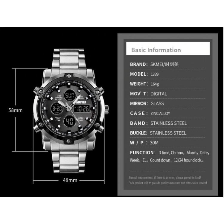 Jam tangan SKMEI 1389 hadir dengan desain yang keren dengan dial digital dan juga analog disertai dengan tiga buah chronograph yang masing-masing mempunyai fungsi sendiri. Jam tangan merk SKMEI merupakan jam tangan yang made in china dibuat di China yang diproduksi oleh Guangzhou Skmei WatchcoLtd. Desain strap serta bodi stainless steel membuat jam tangan ini sangat kokoh dan keren untuk dikenakan sehari-hari ataupun pada acara-acara tertentu.