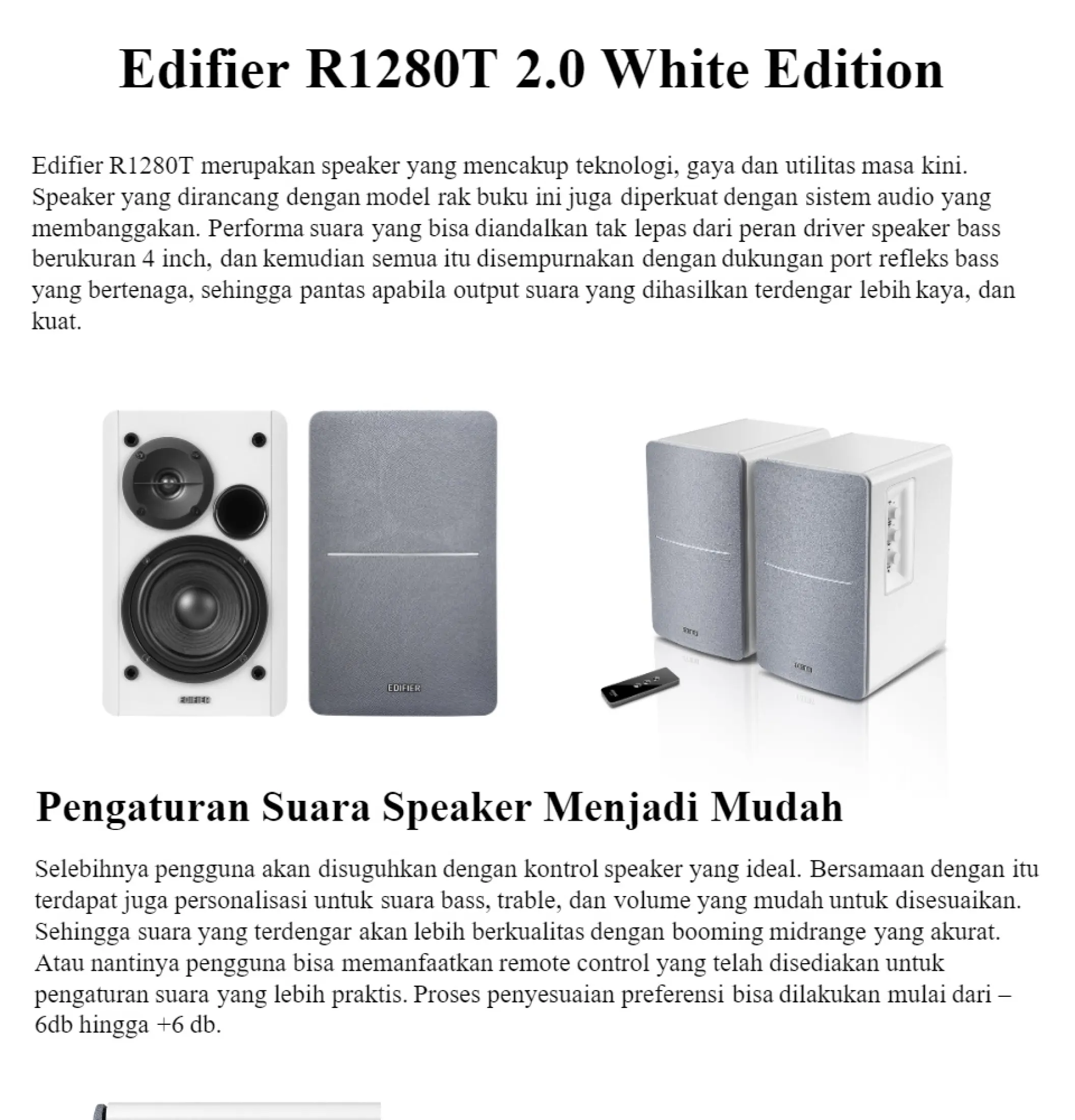 EDIFIER R1000T4 salah satu speaker aktif 20 dari Edifier yang akan memanjakan telinga anda dalam menikmati setiap alunan musik dan lagu favoritTidak perlu berukuran besar untuk menghasilkan suara yang berkualitas itulah yang ditekankan Edifier melalui R1000T4 ini. Jika Anda tidak yakin untuk membeli produk-produk Aksesoris Edifier Anda bisa cek berbagai produk dari. EDIFIER R1280T merupakan sepaker multimedia dari perusahaan audio kenamaan yang menghasilkan suara begitu jernih dengan desain yang menarik.